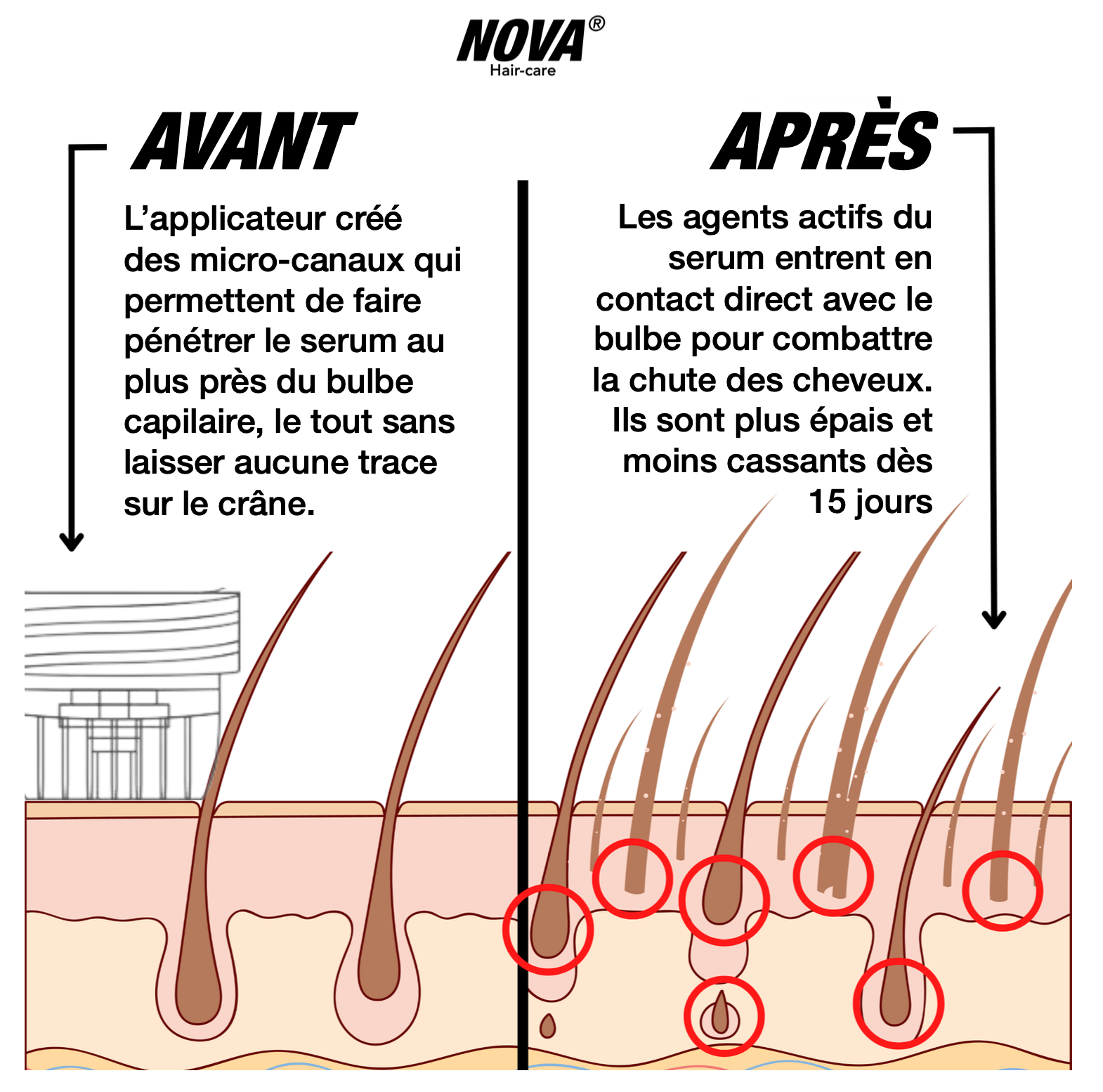 Grâce à l'applicateur par micro-infusion, les actifs pénètrent au plus près du bulbe capillaire, là ou la croissance du cheveux s'effectue.